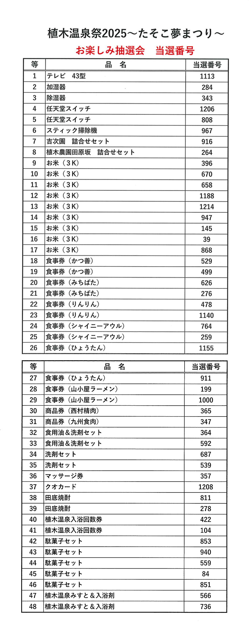 尚、会場で開催できませんでした「お楽しみ抽選会の当選番号が決まりました」ので、お知らせいたします。